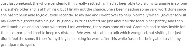 This is a screenshot of my trip itinerary for my Spring Break in March. I felt that this was a good contribution because this was the start of the uproar of the pandemic. Once I came back on the 14th everything changed. Business shut down, traveling limited, and school moved to online for the rest of the semester. This was a very significant time for me.