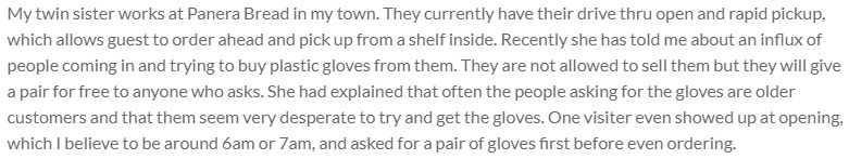 Description of Panera Bread handing out gloves during the COVID-19 pandemic