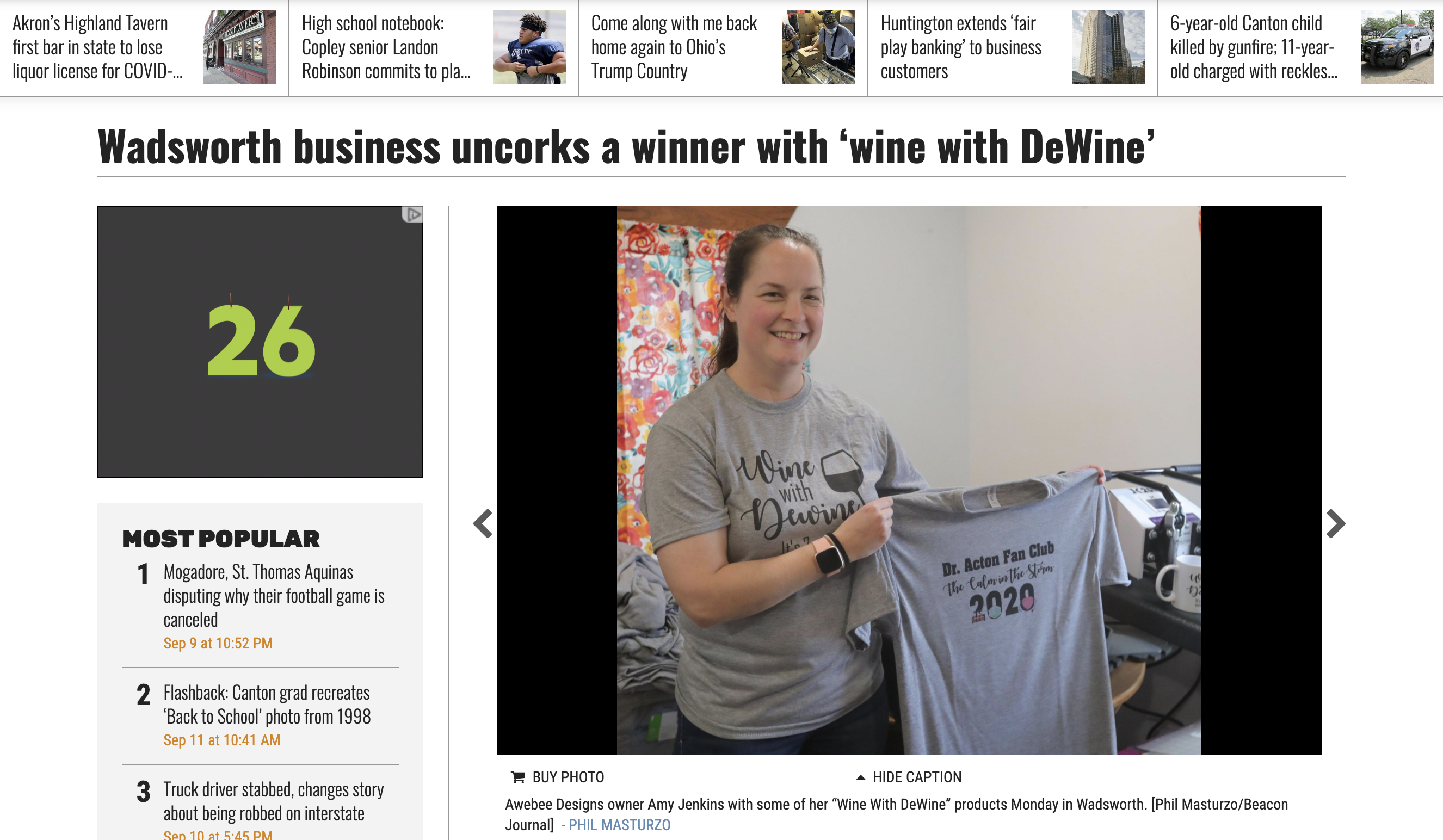 Article about the growing popularity of "Wine with DeWine" memorabilia in Ohio. It is in reference to the daily 2PM EST COVID 19 meetings Ohio's Governor Mike DeWine has. This article discusses a business that helped make this trending merchandise popular.