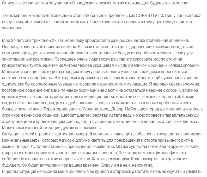 Описал за 20 минут мои ощущения об эпидемии и разместил их в архиве для будущего поколения.