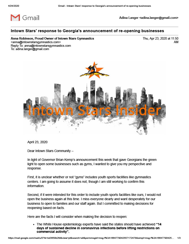 Email from the owner of a gymnastics studio explaining why she was choosing to remain closed despite the governor of Georgia's announcement that gyms would be expected to re-open by April 24.