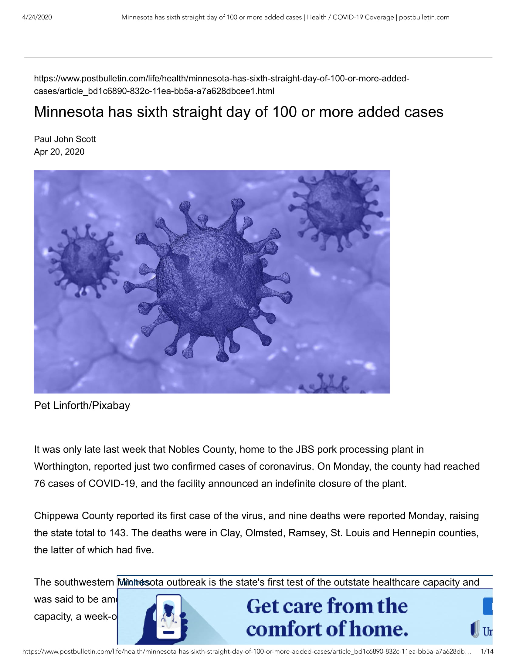 It was only late last week that Nobles County, home to the JBS pork processing plant in Worthington, reported just two confirmed cases of coronavirus. On Monday, the county had reached 76 cases of COVID-19, and the facility announced an indefinite closure of the plant.