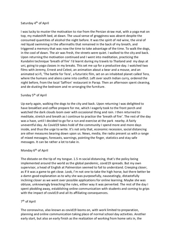 The distaste on the tip of my tongue. 1.5 m social distancing, that’s the policy being implemented around the world as the global pandemic, covid19 spreads. But my own supervisor, a head of English at Palmerston seemed to fail to understand. Creeping closer, as if it was a game to get close. Look, I’m not one to take the high horse, but there better be a damn good explanation as to why she was purposefully, nauseatingly, distastefully inclining closer as we went over possible applications for online learning. Maybe she was obtuse, unknowingly breaching the rules, either way it was perverted. The rest of the day I spent plodding away, establishing online communication with students and coming to grips with the impact of covid19 and all its affiliating consequences.