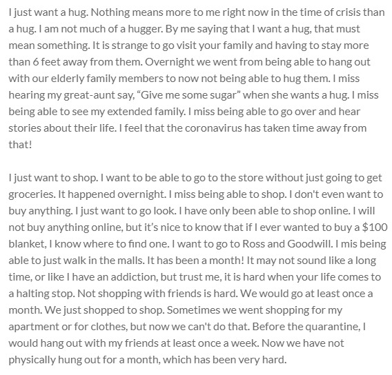 I just want to shop. I want to be able to go to the store without just going to get groceries. It happened overnight. I miss being able to shop. I don't even want to buy anything. I just want to go look. I have only been able to shop online. I will not buy anything online, but it’s nice to know that if I ever wanted to buy a $100 blanket, I know where to find one. I want to go to Ross and Goodwill. I mis being able to just walk in the malls. It has been a month! It may not sound like a long time, or like I have an addiction, but trust me, it is hard when your life comes to a halting stop. Not shopping with friends is hard. We would go at least once a month. We just shopped to shop. Sometimes we went shopping for my apartment or for clothes, but now we can't do that. Before the quarantine, I would hang out with my friends at least once a week. Now we have not physically hung out for a month, which has been very hard.