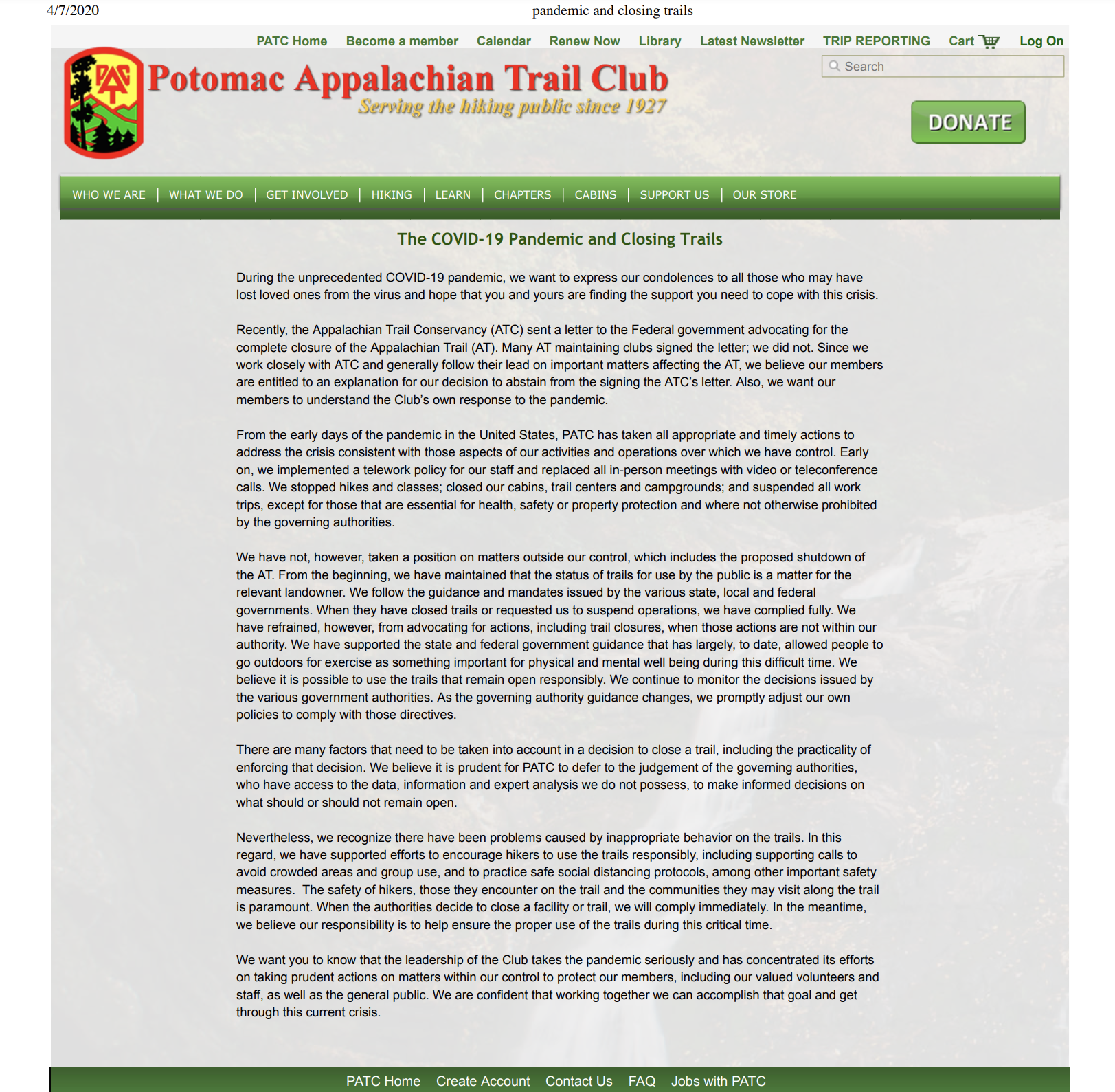 This is the official response of the Potomac Appalachian Trail Club (PATC) regarding the closing of hiking trails during the pandemic. The PATC is a volunteer organization with responsibility for almost 1,000 miles of hiking trails in the mid-Atlantic region, including almost 300 miles of the Appalachian Trail.