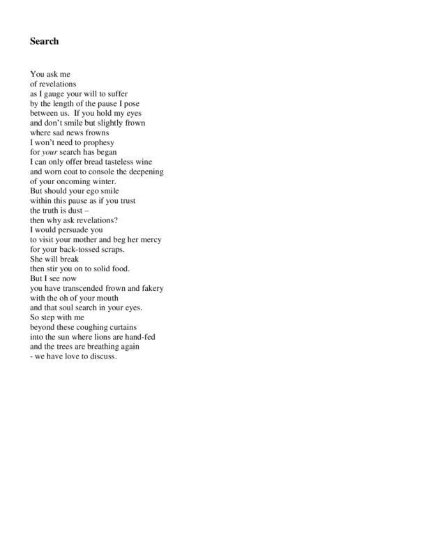 SEARCH is about human life. How we can look back and hear with the ears of our hearts, then and only then, we will understand that Truth is not your truth or my truth, but, THE TRUTH ! Nature will show us the way.