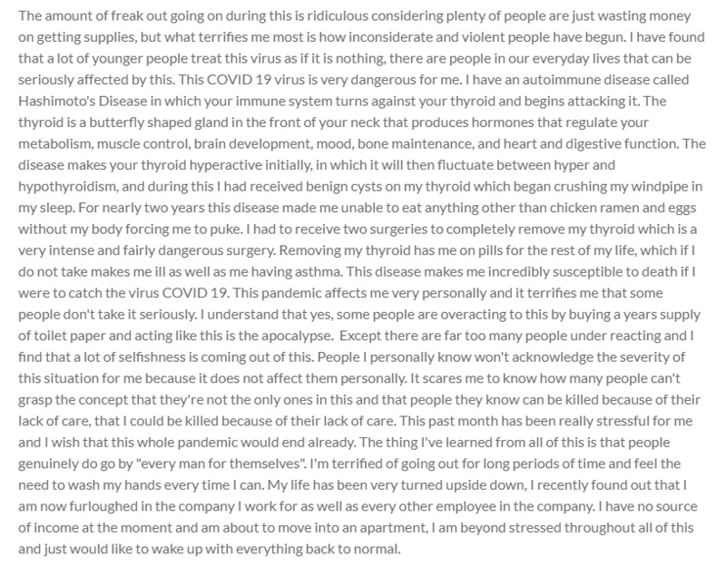 This image shows a grocery shopping line wrapping around the aisles of the store. When the epidemic first started hitting, many people ran to the store to stock up on as much food, water, and toilet paper as they could possibly get their hands on, like it was the end of the world and the store was going to run out of supply.