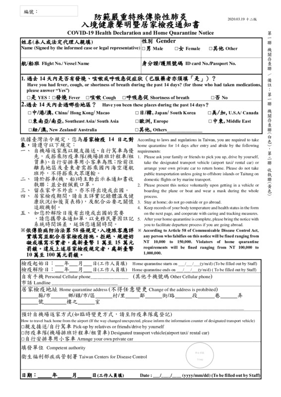 This resource is a checklist and formal notice presented to those arriving in Taiwan that they should quarantine themselves for 14 days. The document includes instructions during the quarantine and a temperature tracking form. #HIST5241