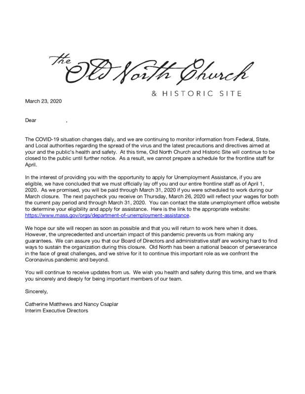 This is a letter sent to all the part time, frontline staff working at Old North Church & Historic Site, officially laying them off effective April 1st. Old North closed to the public on March 6th, but continued paying staff through the end of the month.