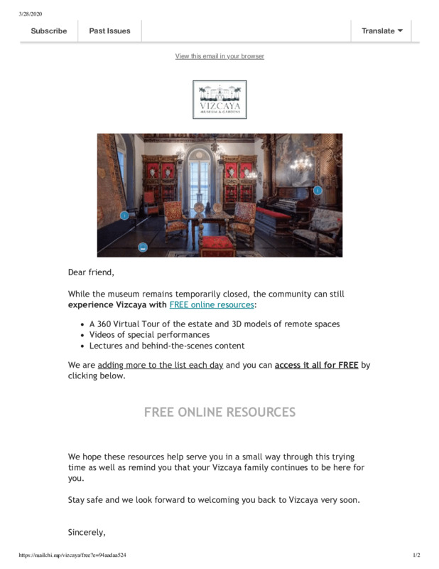 An email from Vizcaya Museum and Gardens, a historic house museum in Miami, FL, that describes several online resources available for the public to explore while the museum is closed during the pandemic. #HIST5241