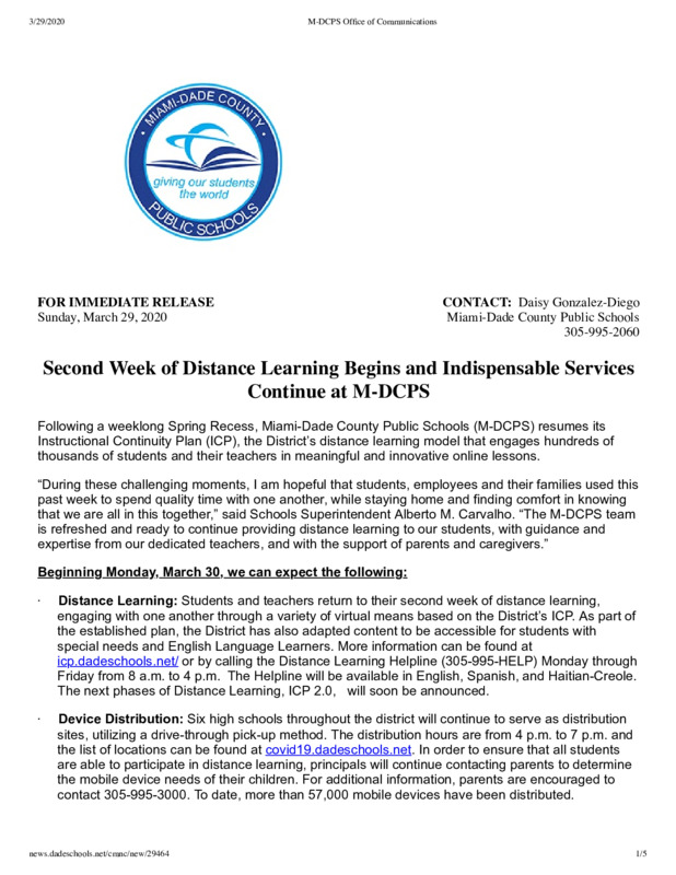 An announcement from Miami-Dade County Public Schools, which provides important information and updates as public schools enter their second week of distance learning due to the pandemic. It includes information on meal distribution, sanitization of schools, information for employees, and online resources, among other areas. #HIST5241