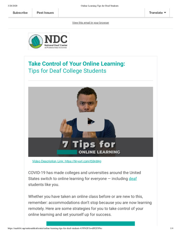 An email received by an academic advisor for students with disabilities. It describes several tips for deaf students as most colleges and universities transition to online learning. #HIST5241