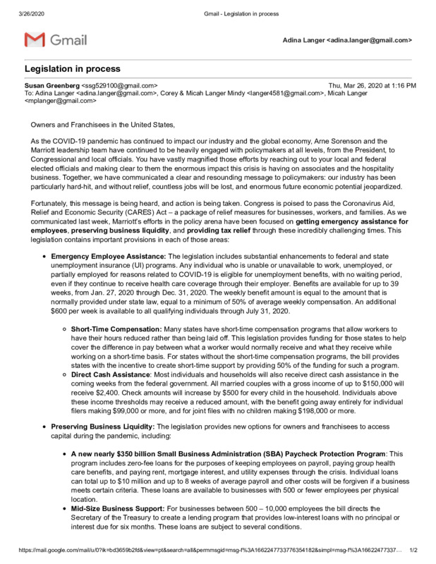 Email from Marriott Owners and Franchise Services aimed at employees of the hospitality industry to inform them of new financial relief packages underway via federal legislation.