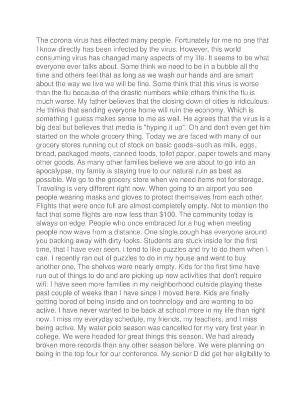 This piece by Sydney Jones provides the reader with a glimpse into her daily life, and how the 2020 pandemic has changed her daily routines, habits, and inclinations. Sydney includes personal thoughts from her family and herself, including: the contracting economy, grocery store policies and panic-buying, her competitive role in sports and college, as well as many other changes that have occurred her local community. Sydney's story highlights many continuities and changes in her social and personal life. An important notion brought up throughout is Sydney's family "staying true" and strong during the pandemic. [added by curator]