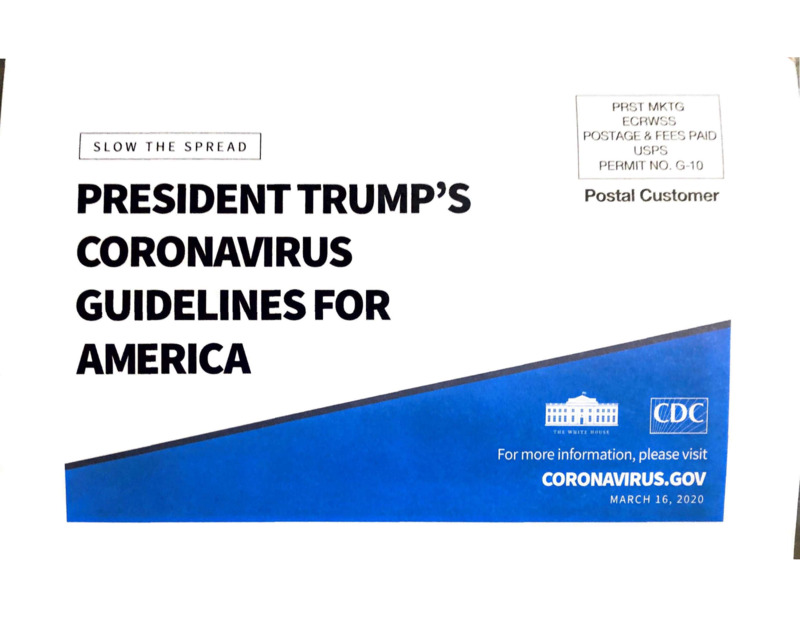 I received this mailer on March 24, 2020. It outlines "President Trump's Coronoavirus Guidelines for America,' dated March 16, 2020. Includes various tips such as "Avoid eating or drinking at bars and restaurants--USE PICKUP OR DELIVERY OPTIONS," and "DO NOT VISIT nursing homes or retirement or long-term care facilities unless to provide critical assistance." Also recommends following state and local authorities' directions and visiting the coronavirus.gov website. "It is critical that you do your part to slow the spread of the coronavirus."