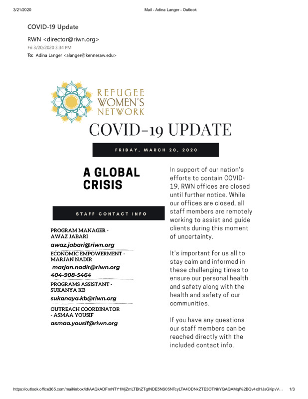 Transition email from Refugee Women's Network describing ways the organization will continue to support refugee families during the pandemic.