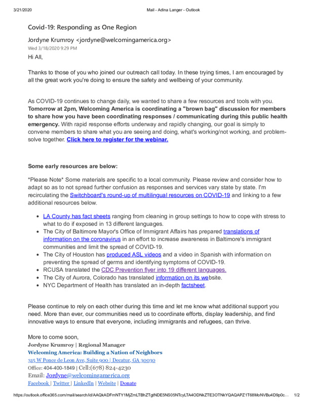 Email from the leader of Welcoming America's One Region subcommittee to share resources for members in metro Atlanta to help vulnerable populations in their municipalities and other networks respond effectively to the COVID-19 crisis--- especially multilingual resources.